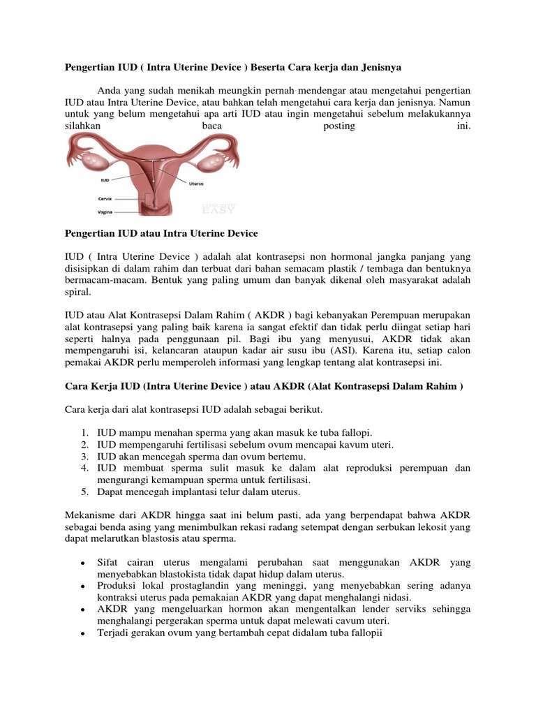 Cara kerja iud. IUD Intrauterine Device adalah alat berbentuk T kecil yang dapat ditanamkan oleh dokter atau perawat ke dalam rahim untuk mencegah kehamilanBagi Anda yang ingin melakukan pemasangan IUD ada baiknya jika Anda mengetahui bagaimana proses dan cara kerja IUD terlebih dahulu. 1 Menghambat kemampuan sperma untuk masuk ke tuba falopii 2 Mempengaruhi fertilisasi sebelum ovum mencapai kavum uteri 3 kerja terutama mencegah sperma dan ovum bertemu walaupun IUD membuat sperma. About Press Copyright Contact us Creators Advertise Developers Terms Privacy Policy Safety How YouTube works Test new features Press Copyright Contact us Creators.