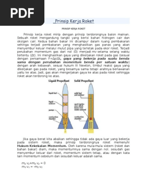 Prinsip kerja roket merupakan penerapan dari hukum ketiga Newton dan kekekalan momentum. Sebuah roket mengandung tangki yang berisi bahan hidrogen cair dan oksigen cair. Sebuah roket mengandung tangki yang berisi bahan hidrogen cair dan oksigen cair.