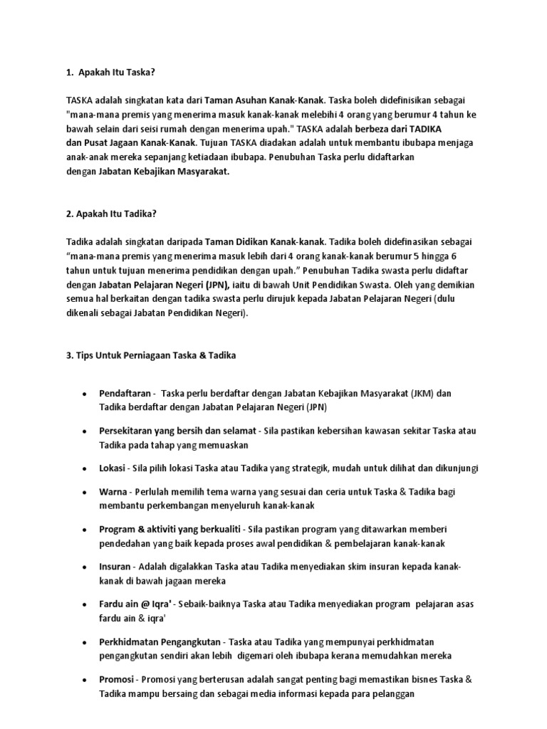 Antara yang penting untuk ada dalam menguruskan TASKA Rumah adalah syarat-syarat dan peraturan antara pengusaha TASKA dan ibubapa. Academiaedu is a platform for academics to share research papers. Sebelum ambil keputusan menghantar anak ke Taska survey dulu reputasi taska berkenaan.