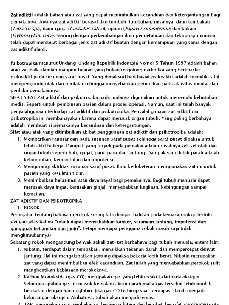 Artinya jika belum mengonsumsi bahan jenis ini maka perasaan aneh pada tubuh kita akan terjadi seolaholah ada sesuatu yang hilang. Zat adiktif adalah obat serta bahan-bahan aktif yang apabila dikonsumsi oleh organisme hidup dapat menyebabkan kerja biologi serta menimbulkan ketergantungan atau adiksi yang sulit dihentikan dan berefek ingin menggunakannya secara terus-menerus yang jika dihentikan dapat memberi efek lelah luar. Demikian contoh soal zat adiktif dan psikotropika dengan pembahasannya.