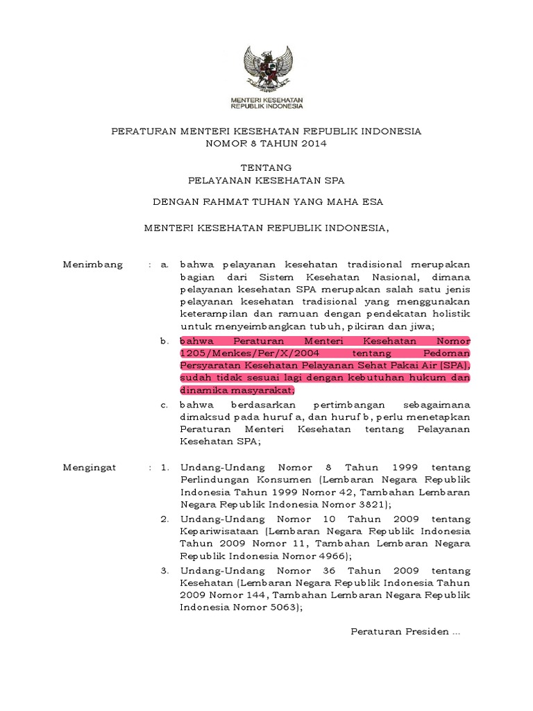 Pmk No 8 Ttg Pelayanan Kesehatan Spa Pdf